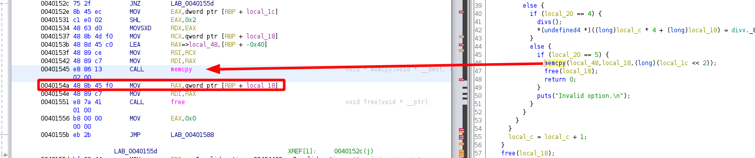 So here we see that between the vulnerable buffer local_48 (which is handled inside of the vulnerable memcpy call we saw earlier) and the bottom of the stack there is the local_18 pointer that contains our calculations. It will get overwritten as part of the overflow. This is a problem since this address is freed prior to our code being executed as you can see above.