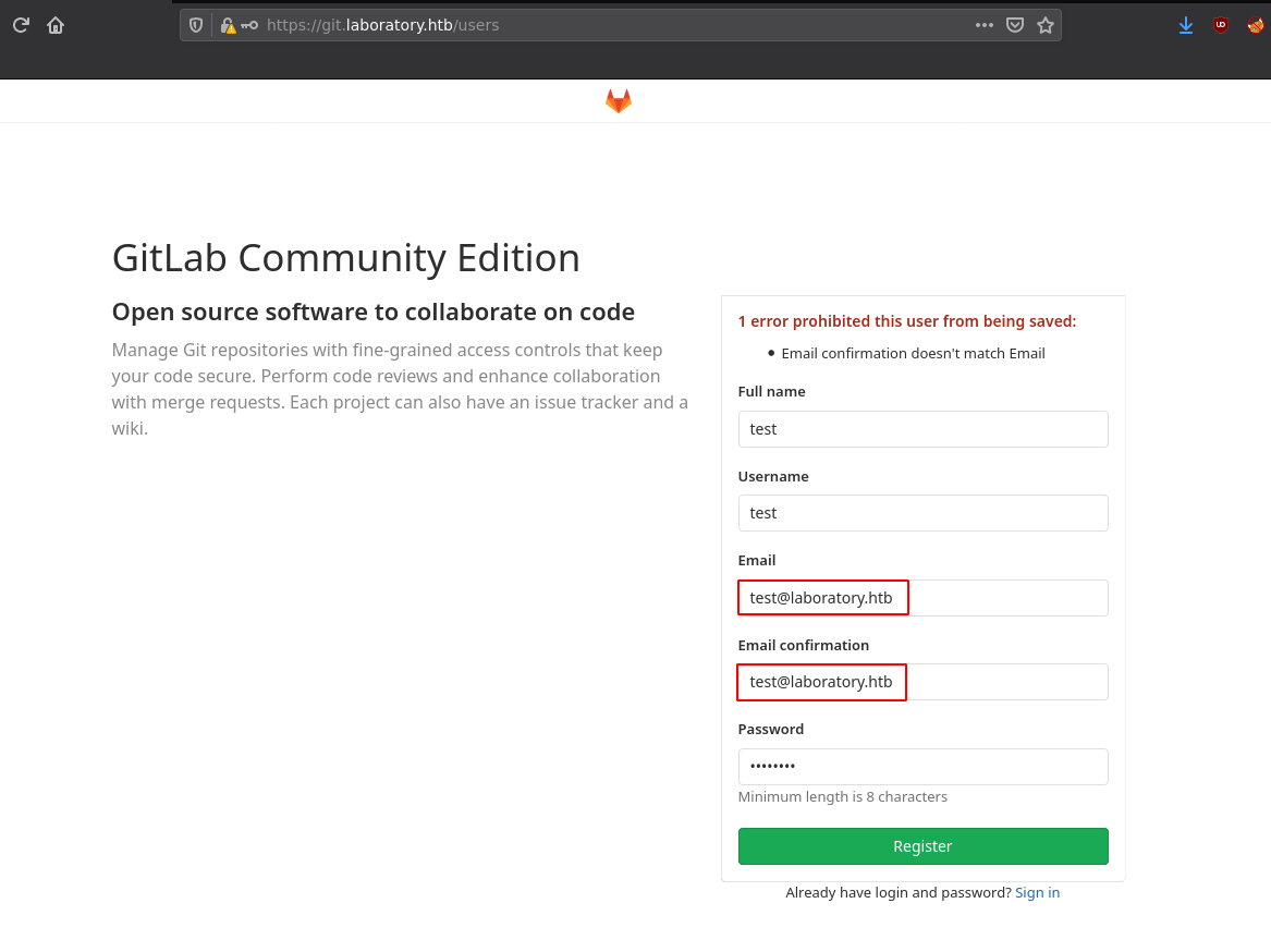 | Subject Alternative Name: DNS:git.laboratory.htb
