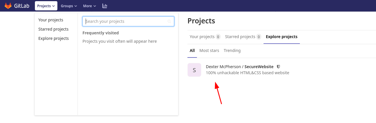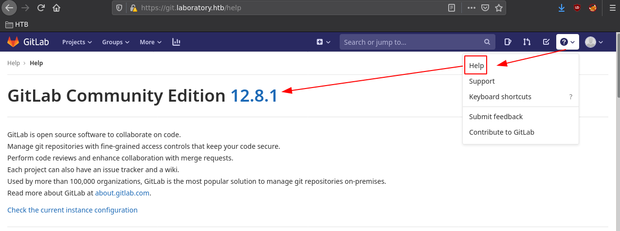 Once our account is created we get access to the gitlab instance, and by clicking the Help tab we see that we are on a Gitlab Community Edition version 12.8.1