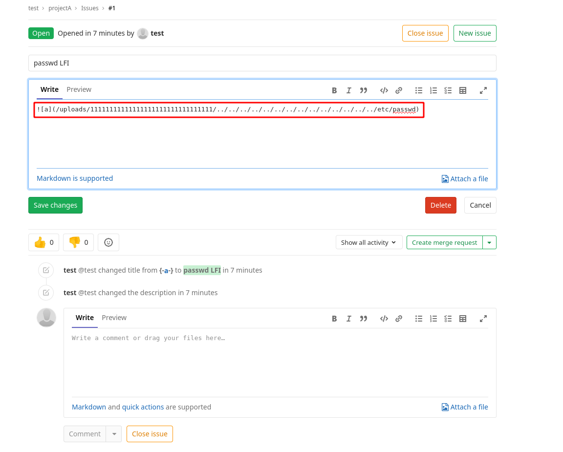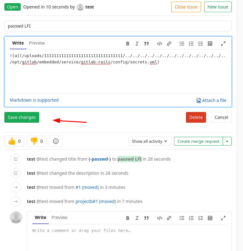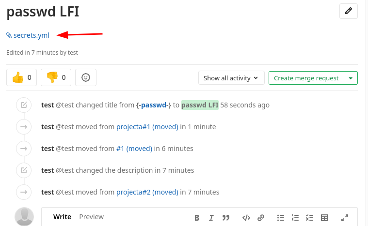 First we create 2 projects, then we create an issue on projectA that contains the following payload inthe issue description: