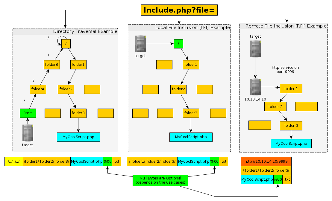 You can see that this is indeed a Directory Traversal Vulnerability, because it is using the ../ special characters to change directory, going up the directory tree, in order to reach the root / directory. The difference with Local File Inclusion vulnerabilities, is that you have to use ../ to go up the directory tree. with LFI you could start with the root folder / and go down from there e.g : /etc/passwd The URL ends with a null byte ( %00) in order to end the string. For example: myCoolScript.php%00.txt - Meets .txt, but is going to execute .php for that matter, the "en" is there to meet the script's requirement but it ends right before that thanks to the null byte.