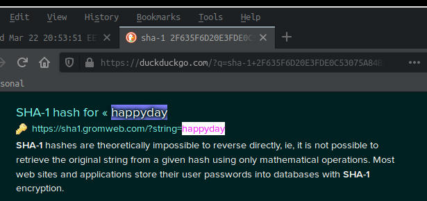 Paste the Hash into your favorite web-browser along with the SHA-1 keyword, and you should easily find the original "happyday" password.
