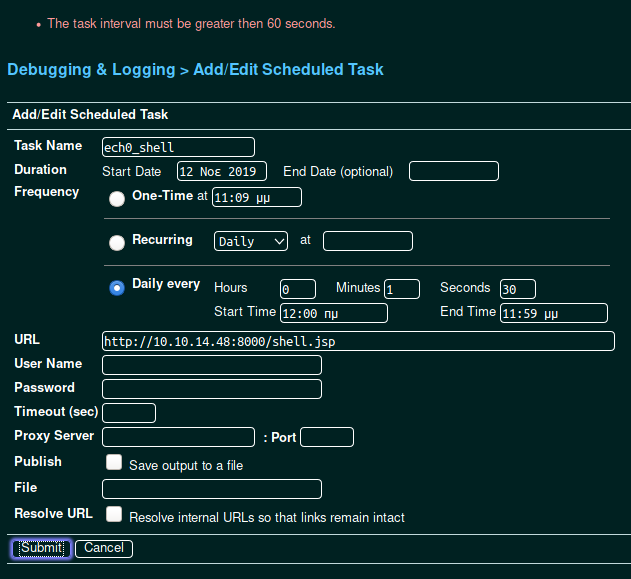 Once on the coldfusion Dashboard, logged in as admin, we will upload a reverse shell tcp that we will generate using the msfvenom command, naming it as shell.jsp. The Scheduled task will download the shell.jsp payload , so we will need python to run the http server for us within a second terminal. We will upload it as a scheduled task, browse to it within our web browser, and catch the incoming reverse shell connection using the netcat command.