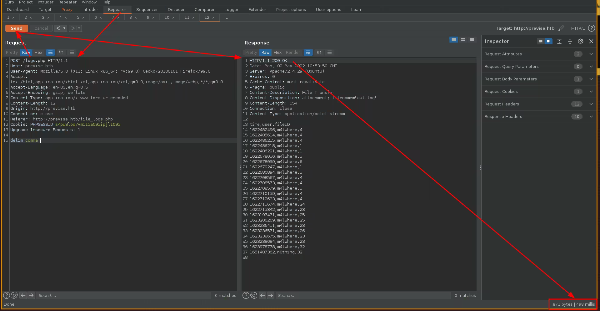 And here we see that the logs.php file has a line which runs a python script (log_process.py) that takes the delim parameter value as arguement. So let's intercept the POST request to that page: