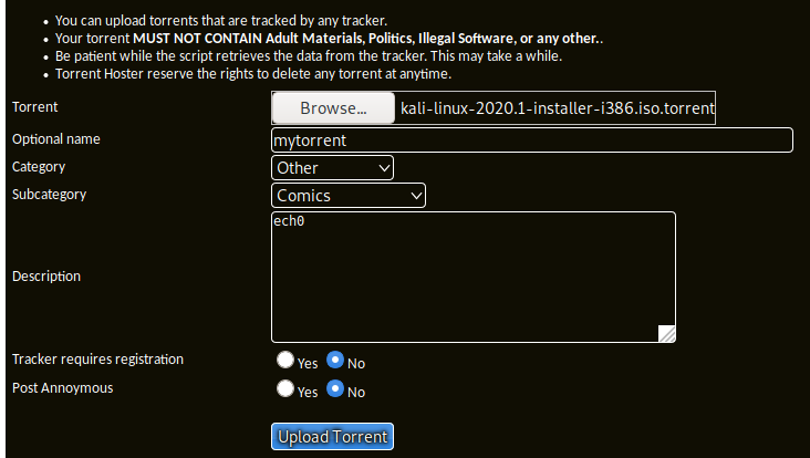 heading over to the uploading page we'll submit some random torrent file :