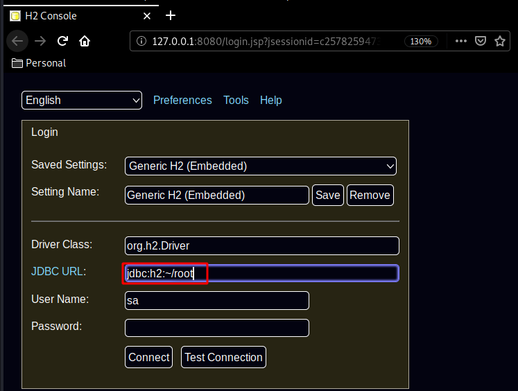 No need to login we can just change the JDBC URL to /root to gain access to the console :