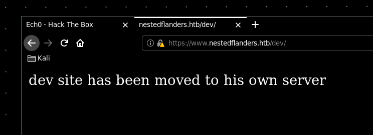 So here we are greeted by a default page on https://www.nestedflanders.htb , not too interesting so we enumerate it further using dirsearch:
