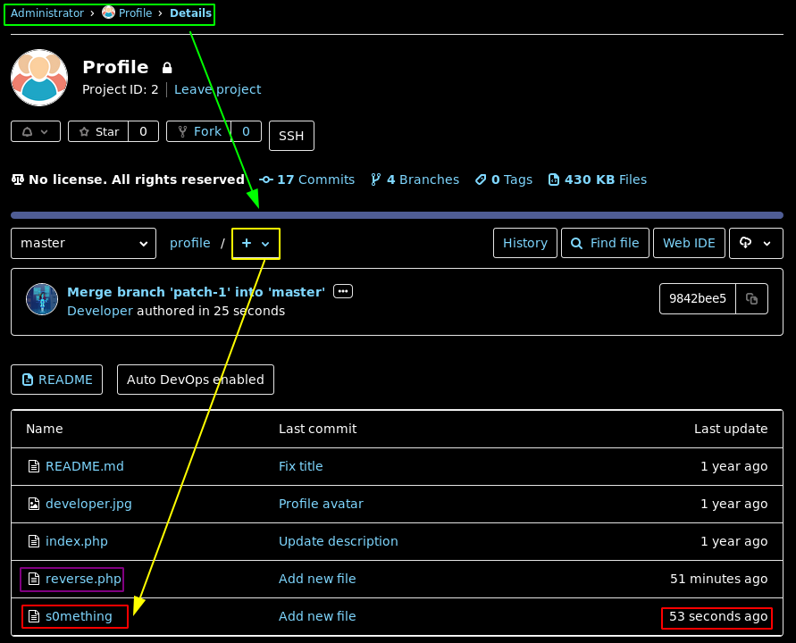 www-data@bitlab:/dev/shm/nowhere/profile/.git/hooks$ touch post-merge