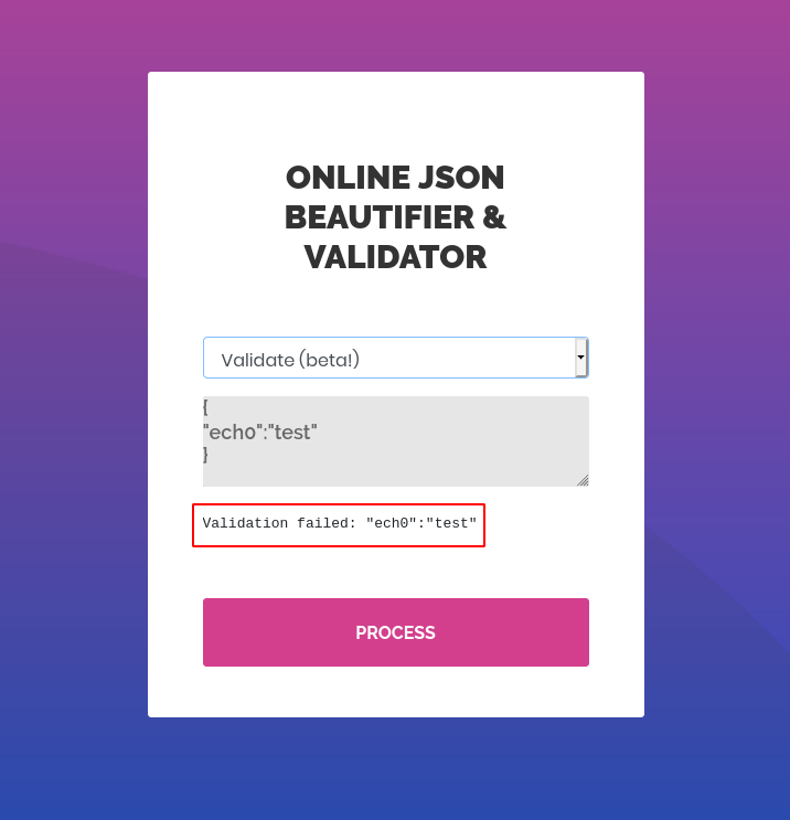 The website is basically a simple json parser, however when we take a look at the 'validate' option, giving it some random string makes it error out and reveals out the backend that's being used: