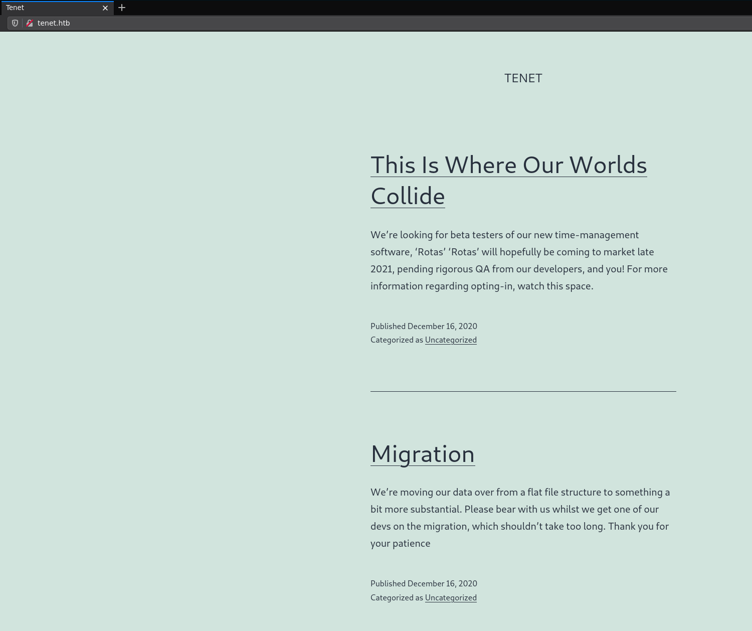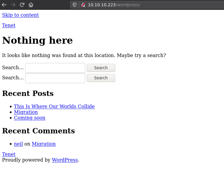 The wordpress site isn't being rendered properly because our browser can't resolve the tenet.htb domain name so let's add it to our hosts file: