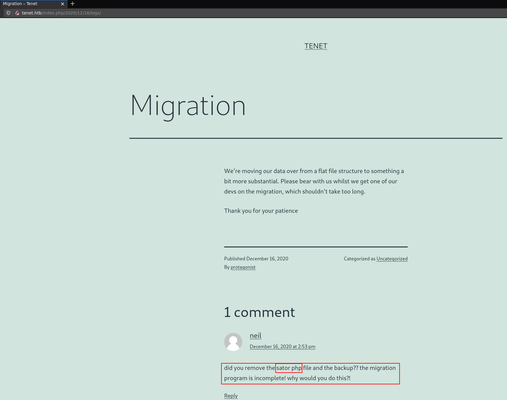 Now that the wordpress site renders properly, we can run wp-scan on it however this really takes forever so instead we simply take a look at the blogposts, and we find the one mentionning the sator.php file:
