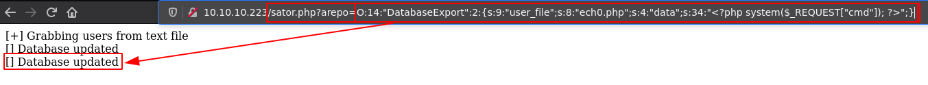 And basically here we see that sator.php has an arepo parameter we can use to pass a serialized object which will then enter the unserialize() function, so basically from here we know that we need to create a malicious serialized object to take over the DatabaseExport function that gets called right after the unserialization, to do that we create the following php file: