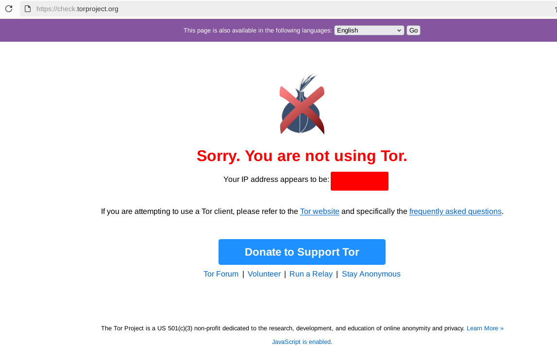 Now access https://check.Torproject.org, and you should see a warning saying you are not using Tor, due to having the connection originating from the residential Proxy IP. This means that you have successfully completed the (you -> Tor -> residential proxy -> website) setup, effectively hiding that you're using Tor from the destination website.