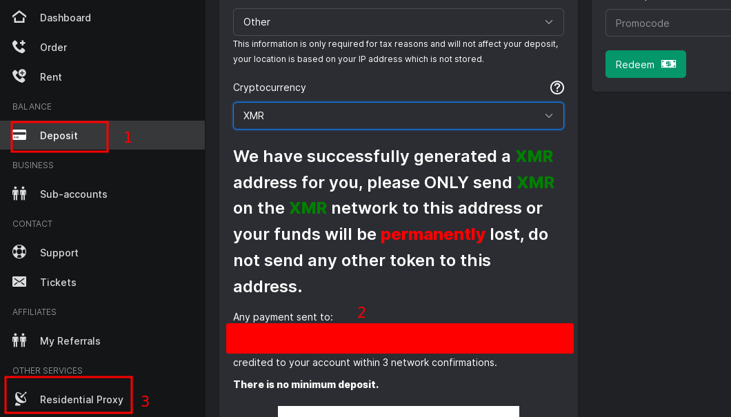 The next step is to deposit Monero into the website and purchase the proxy.