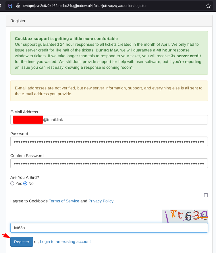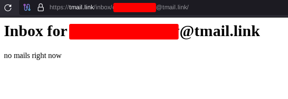 In our example below we'll use Cockbox. but first thing we need is a non-KYC email provider, to do so we could follow Privacy Guides' recommendation and create an account on Tuta, but for simplicity I'll use a temporary email from tmail.link (now defunct). You can use cs.email or yopmail instead.