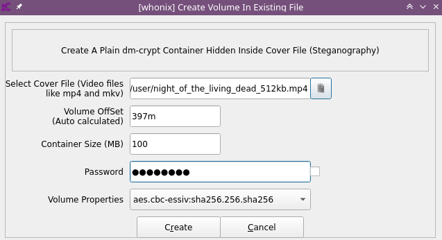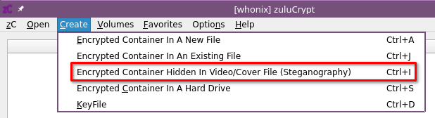 Switching back to zuluCrypt, we click on "Create", "Encrypted Container Hidden In Video/Cover File (Steganography)" or use the keyboard shortcut CTRL+I to commence the process.