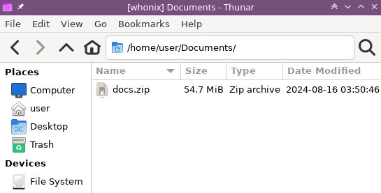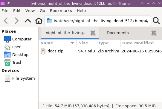 We can now use the file manager (e.g. Thunar) to copy our secret documents archive (docs.zip) into the mp4 container