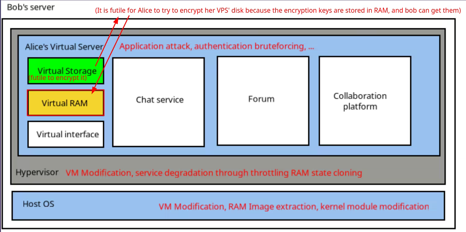 - Decryption keys: (eg: her https private key, the disk encryption key, allowing Bob to decrypt any data stored either in RAM or on the VPS' disk)