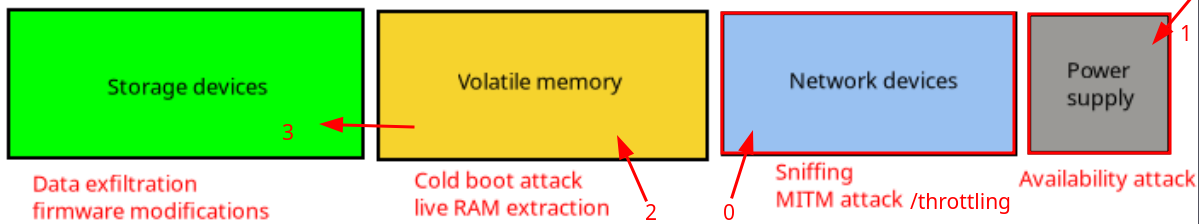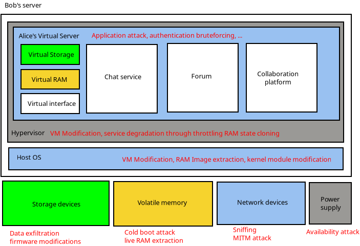 - Run an evil maid attack: inject their own code in the bootloader, in Alice's OS image or inside the hypervisor which Alice can't monitor