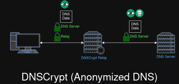 Anonymity ✳️ The protocol does not offer built-in anonymity protection, but it can be used over Tor. ✳️ The protocol does not offer built-in anonymity protection, but it can be used over Tor. βœ… DNSCrypt has a feature called Anonymized DNS, where instead of connecting to a DNSCrypt server directly, a user can connect through a relay DNSCrypt server to relay data over to that server. βœ… Tor offers anonymity protection (maybe same thing for VPN but a little different) ❎️ Unencrypted authoritative DNS queries (done by the local DNS server) can allow the user to be deanonymized by a 3rd party adversary