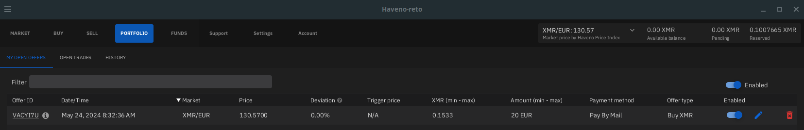Here we wait approx 20 minutes for the monero transaction to be validated by the network, then the offer will appear as enabled: