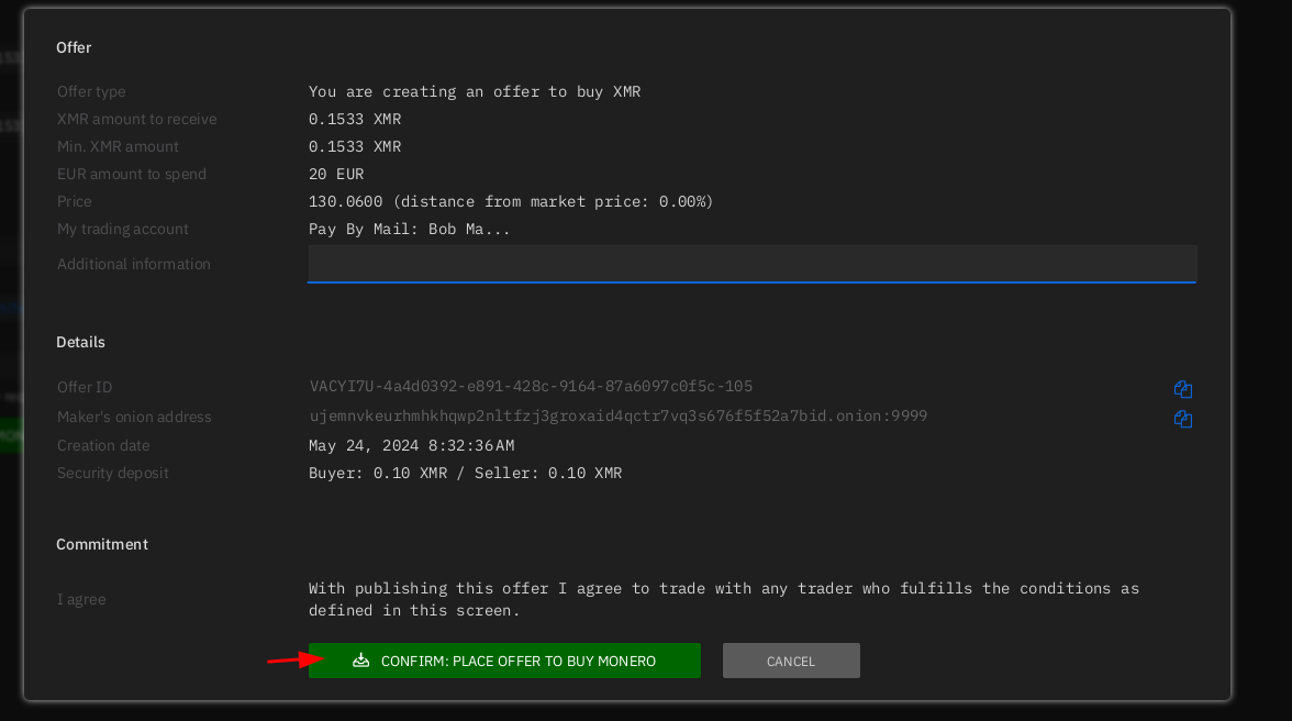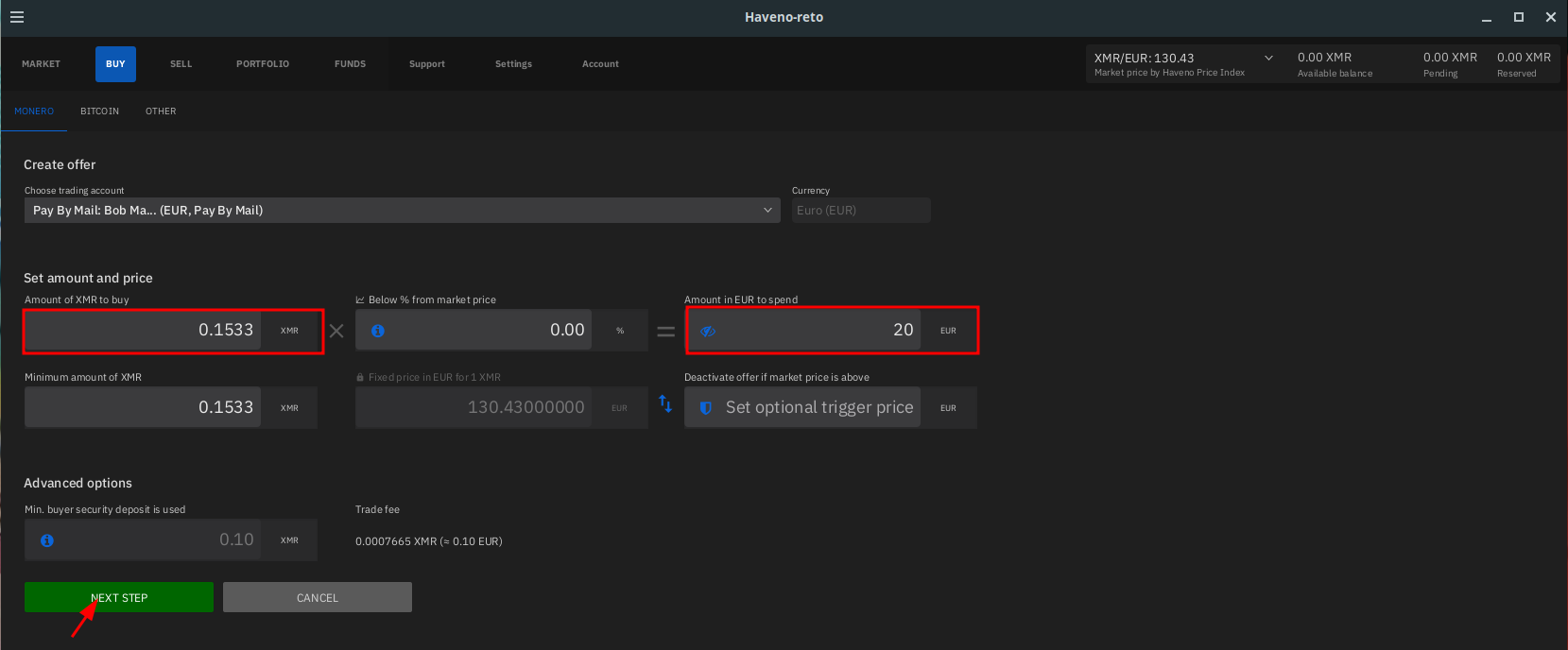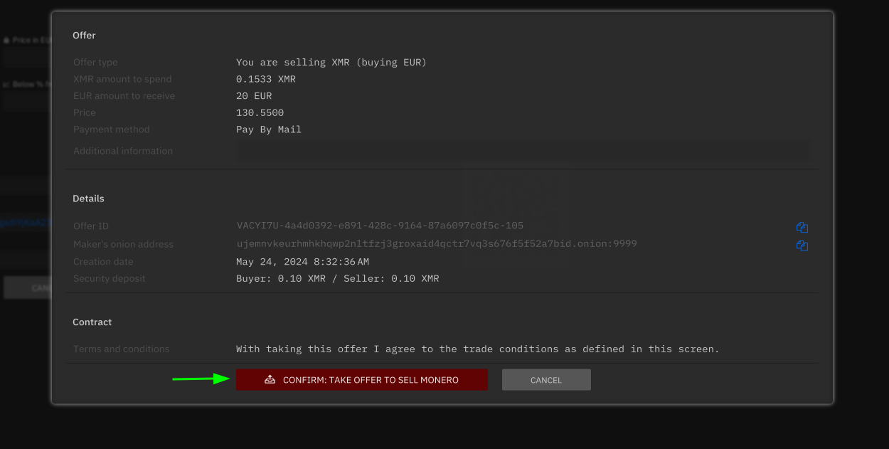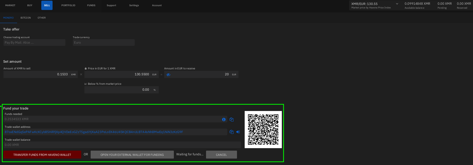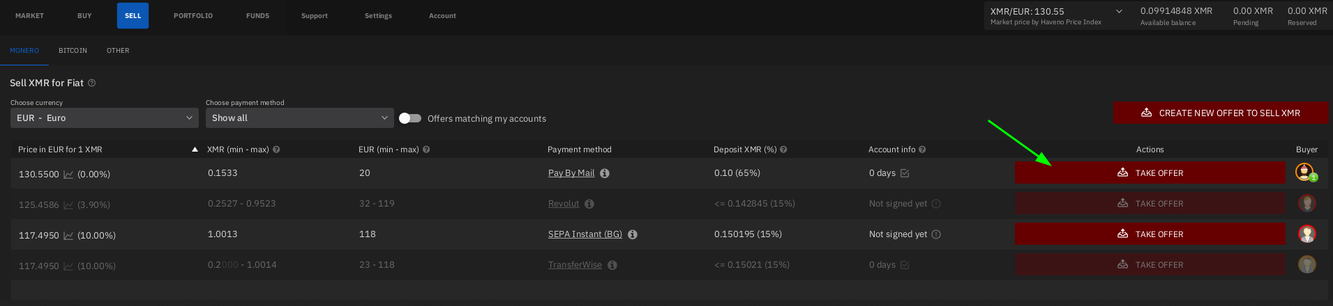 Then we go into the "Sell monero" section and we take Bob's offer: