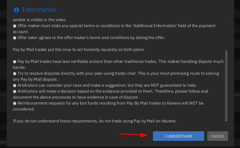 Make sure you understand the risks that cash by mail transactions have, then click "I understand":