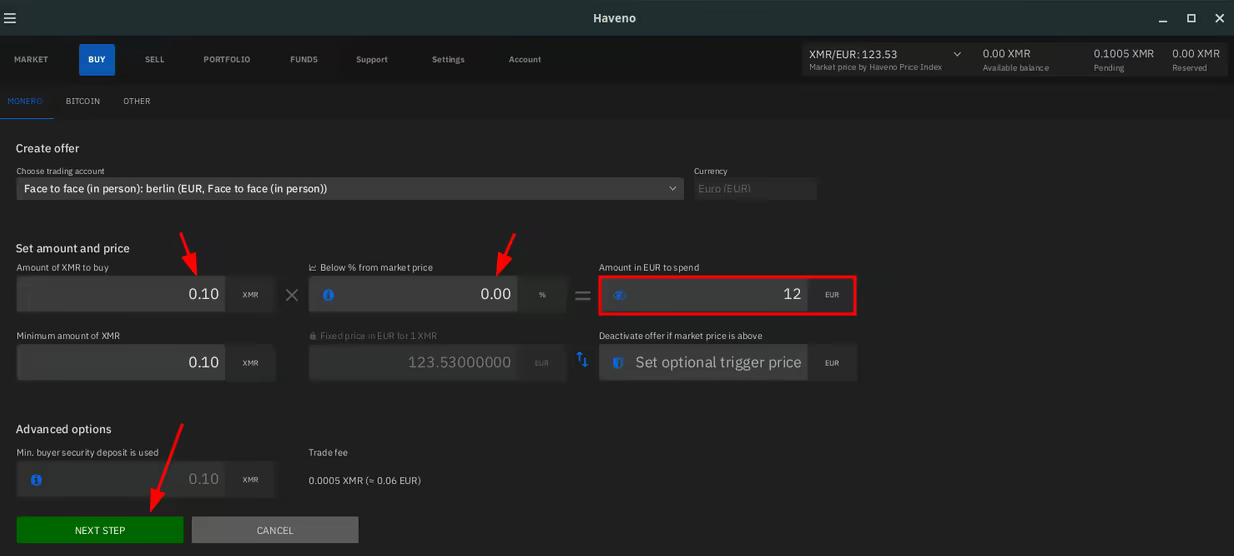 So here we want to purchase 0.10 XMR, for the current market price, which amounts to 12 euros. then hit next step: