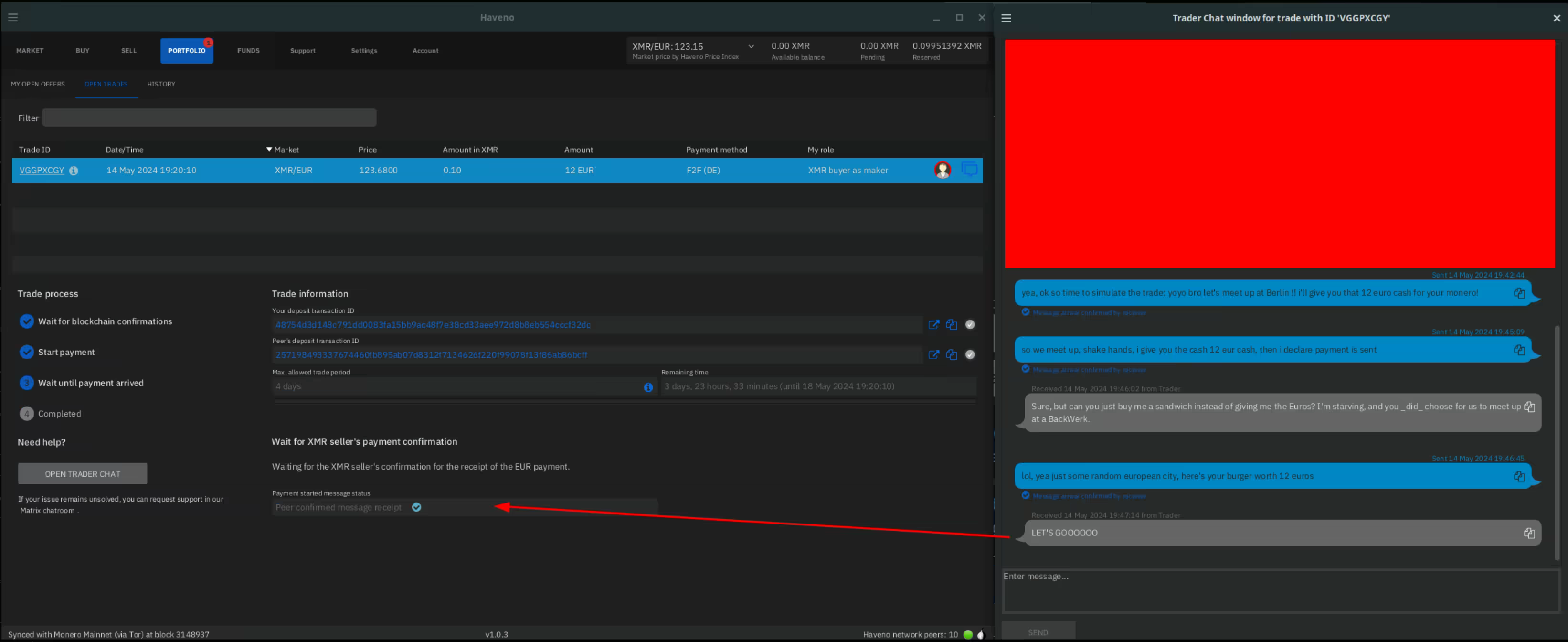 Once the security deposit has been validated by the network for the other party, you will get a notification that the trade can begin: