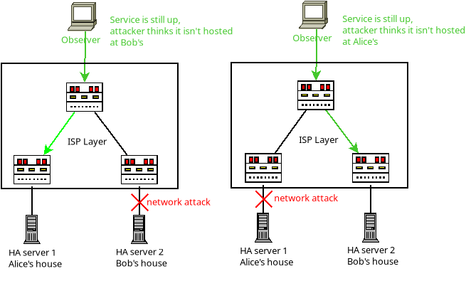 In the above scenario if the onion service operator had setup a redundant, highly available server then connections would have been seamlessly sent to another server in the redundancy pool, thus preventing the adversary from extracting location information based on their operation. This works best with a server in a different country or region , making a coordinated attack by several adversaries a requirement in order to use this method for deanonymization.