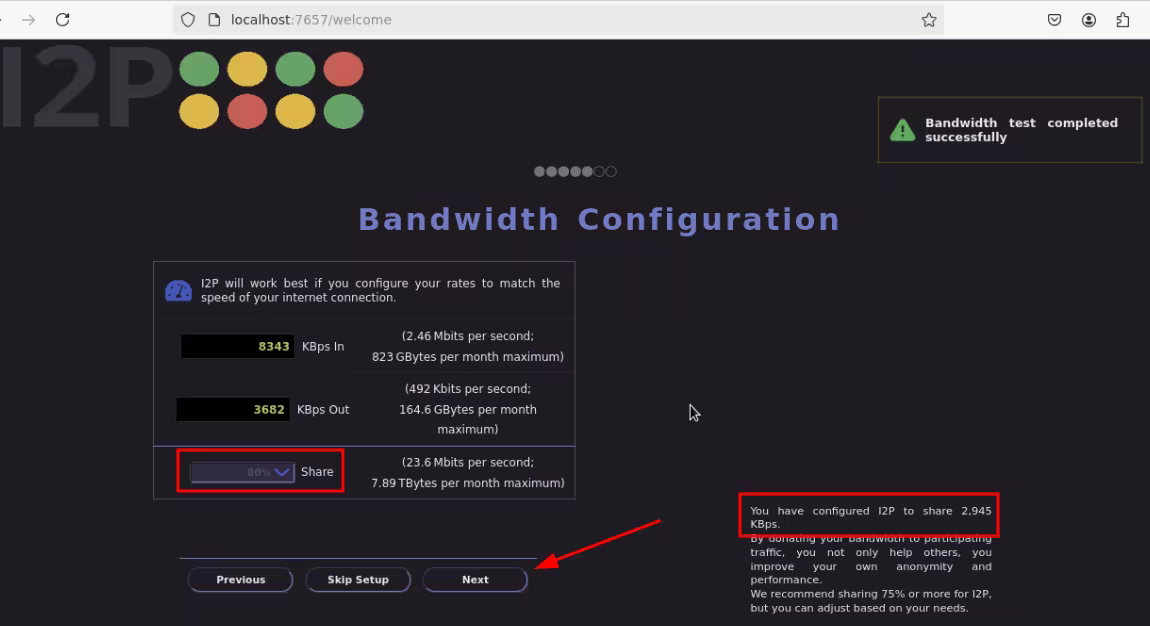Now you can choose how much bandwidth you want to use for I2P. You also set the transit bandwidth expressed as a percentage of total I2P bandwidth. It's recommended to keep it at 80%: