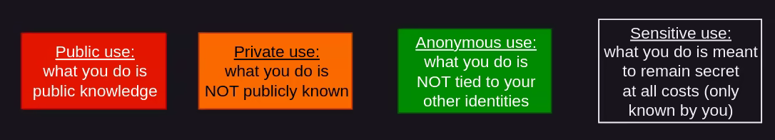 As we said previously, segmentation is required for each internet use. This extends to the Identity you use online. For example you cannot use your real name when trying to use the internet anonymously. So you need a different identity for each use case: