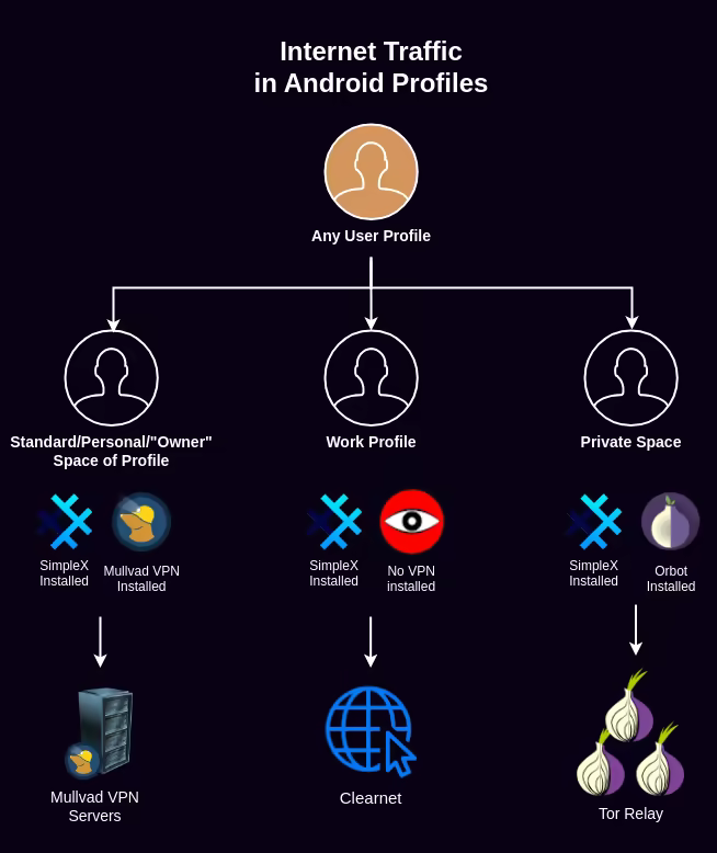 However, this is also true for Work Profiles and Private Spaces, which live inside of User Profiles. So for example, if you install Mullvad VPN inside of the standard space (sometimes called "Personal" or "Owner" profile) of the user profile, and then you browse the web with Firefox that is installed on the Work Profile or in the Private Space, those connections will NOT route through the Mullvad VPN, because they have their own dedicated VPN slots.