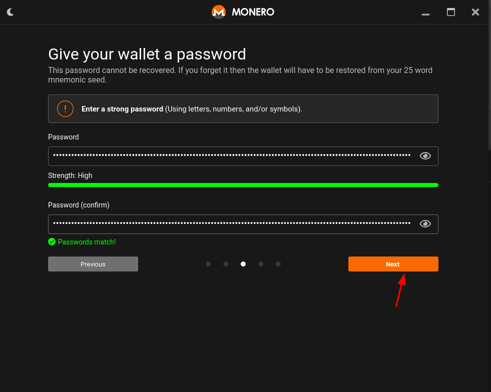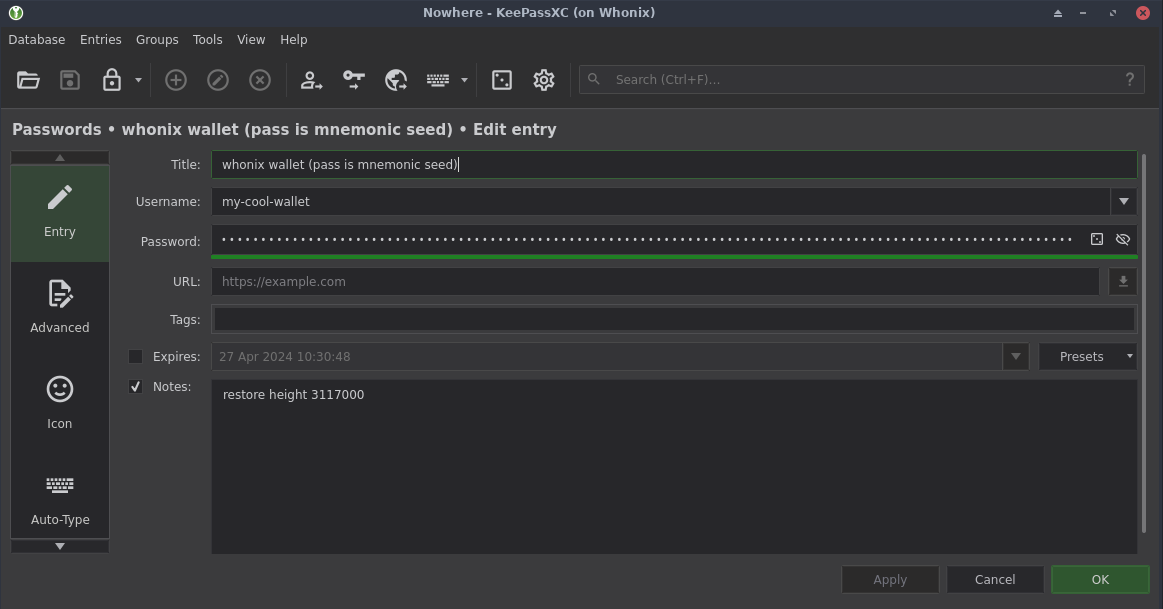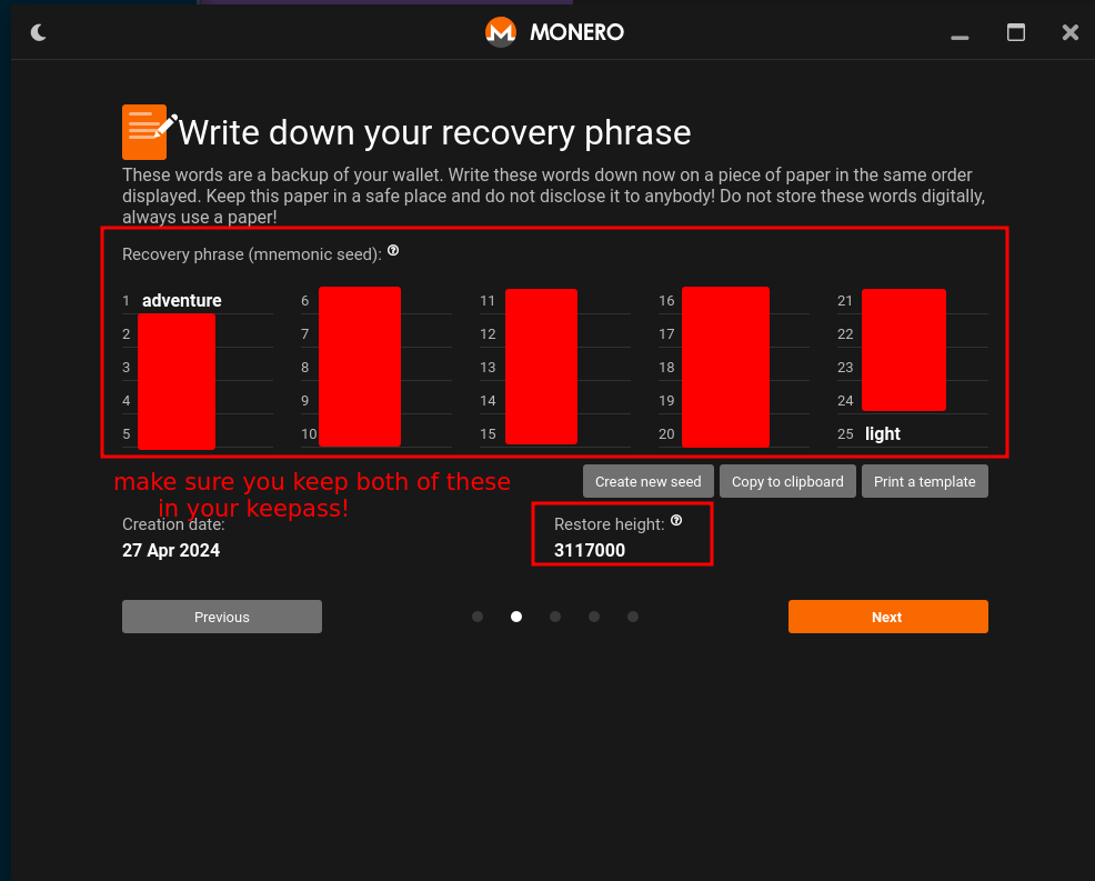 Here very important, make sure you save your monero mnemonic phrase (recovery phrase) into your keepass, along with the recovery height, :