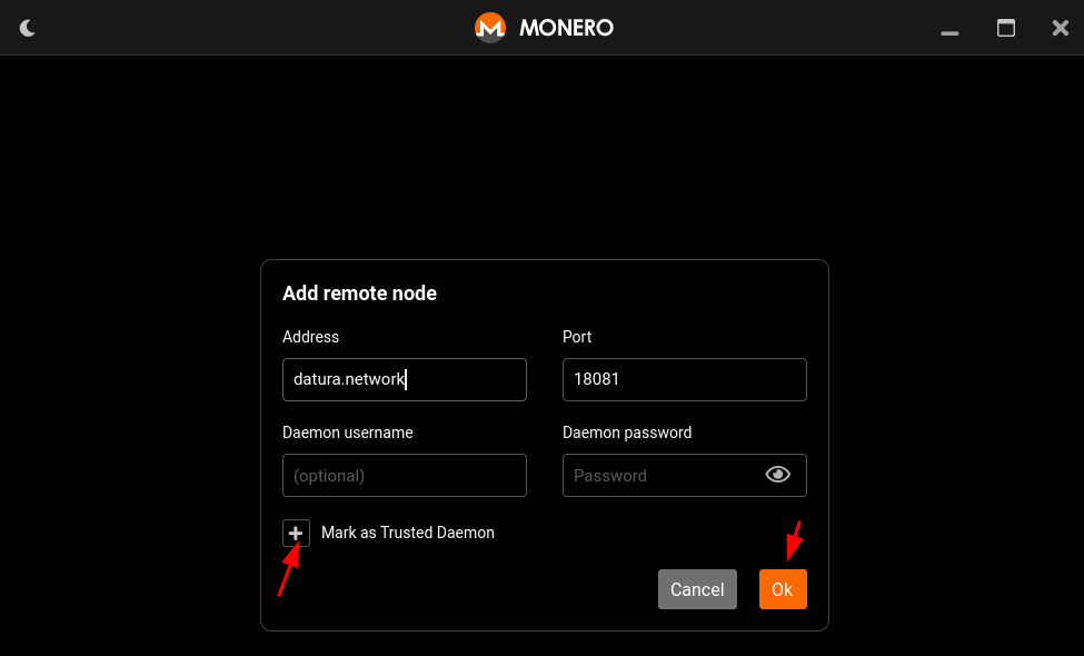 Now with this setup we can use .onion monero nodes as follows (either pick one you trust from https://monero.fail/ for example my .onion monero node at this URL: http://nowherejezfoltodf4jiyl6r56jnzintap5vyjlia7fkirfsnfizflqd.onion:18081 or more preferably (as Chainalysis is running an unknown amount of malicious nodes), host your own monero node as explained in this tutorial.