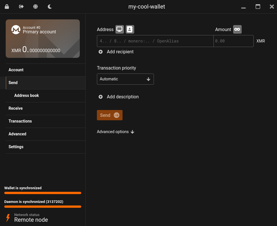 Here again, wait for the monero wallet to finish synchronizing to be able to receive and send monero: