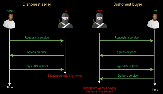 First, one must understand why multisig wallets are important: they allow us to trade without needing too much trust. When someone new comes in contact with a community on the Free Web they can be anyone and disappear whenever they want. Without more information and a track record there is a high risk they are a scammer. As an outsider they also risk being scammed by an established member that would then use their status to deny it. Let's describe first how such a deal could take place:
