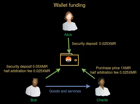When two individuals decide to trade with each other they will first need to agree on an arbitrator and a fee (traditionally 5%, can be negociated with the arbitrator themself), this fee is paid by both individuals.
