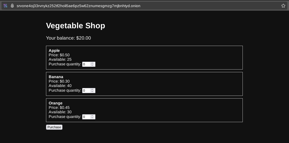 Public Hidden Service URL - This is used for accessing the hidden service as a client. Place this URL in your NGINX configuration to expose the vegetable shop service at port 80.