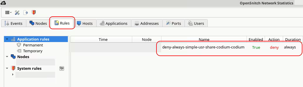 Go back to main OpenSnitch UI window and go to the Rules tab. Here you can see the rule that was automatically created and enabled when we clicked Deny on the previous pop-up. You can right-click to edit the rule like Allowing instead of Denying, or to delete the rule (deleting the rule will cause OpenSnitch to ask you again about that app).