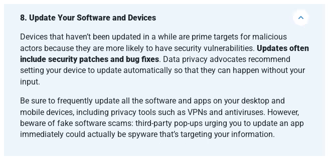 I decided to take a closer look at two sections, as they are often the most lax when it comes to privacy advice: the OS and the VPN. Since they don't even mention the OS, which should be a basic part of these kinds of lists, let's focus on the "Update your software and devices regularly to fix any security weaknesses" section, which should at least cover it.