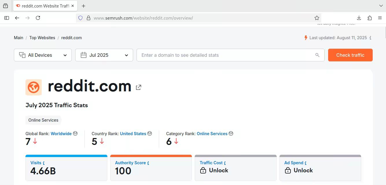 As of July 2025, Reddit is the 7th most popular website worldwide, measured by web traffic, which puts it close to or even above Wikipedia's traffic, depending on the source you check on.