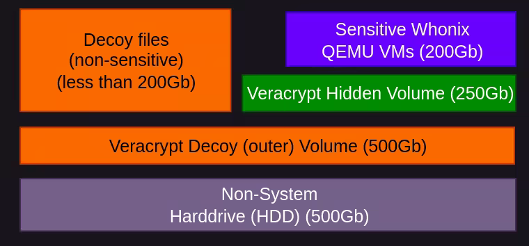 With this setup, you are ready to proceed. The non-system harddrive needs to be 500GB big because in it the veracrypt decoy (outer) volume will span the entire drive (500Gb), and the hidden (inner) volume will span half of that entire drive (250Gb), in order to be able to contain the Whonix QEMU VMs which are 200Gb big.