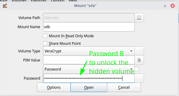 Here is the important part: you mention both passwords: the top one is Password A: to unlock the decoy volume, and the bottom one is the secret password, you must be the only one that knows it because it is the key to unlock (and reveal) the hidden volume NEVER WRITE IT DOWN, ALWAYS REMEMBER IT!